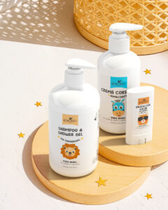 Se incluye una gama completa de productos diseñados para el cuidado diario del bebé como: shampoo y shower gel; crema corporal humectante; aceite para masaje relajante; roll on para aliviar picaduras; perfume sólido; protector solar mineral FPS50 y PA+++ en barra y bálsamo reparador para mamás.