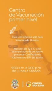 Centro San Juan, ubicado en Calzada San Juan 21-14 zona 7 Kaminal Juyu 1, conocido como “El edificio naranja” pondrá a su disposición el área del primer nivel para realizar la verificación de datos, registro y la aplicación de la vacuna AstraZeneca (primera, segunda y tercera dosis), Moderna (segunda y tercera dosis) y Pfizer (primera, segunda y tercera dosis) designadas por el ente encargado de regular la aplicación de vacunas.