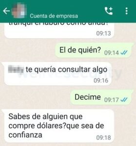 Luego de mantener una conversación mínima, llega un mensaje fuera de lo común, tanto por los mensajes que se intercambian, así como por la relación que se puede tener con la persona cuya identidad fue suplantada: se pregunta por personas interesadas en comprar dólares estadounidenses.