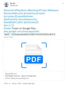 Más allá de la app PDF Reader Scanner, en lo que va de 2022 son constantes los reportes de apps disponibles en Google Play distribuyendo este troyano. En Twitter, se reportaron decenas de aplicaciones maliciosas en los últimos meses. Algunas registran hasta 10.000 descargas. Una de las razones por la que Joker continua logrando vulnerar las barreras de seguridad de Google Play es porque los actores maliciosos han estado constantemente buscando nuevas técnicas para lograr ser efectivos.