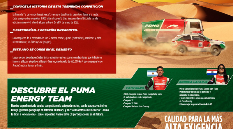 La multinacional Puma Energy anunció que será parte del Rally Dakar 2022, Edición 43, Arabia Saudita, la carrera más dura del mundo, posicionando en alto la calidad de sus combustibles y lubricantes, por medio de su equipo regional representando con dos prestigiosos pilotos de Paraguay y Argentina.