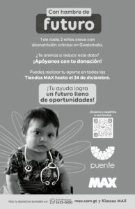 » En Puente creemos profundamente que cada niño merece crecer sano y amado. Con el apoyo de MAX y de los guatemaltecos que se suman a esta causa, podemos transformar más vidas y construir una nueva generación de niños y con un futuro lleno de oportunidades. Porque invertir en la primera infancia no solo cambia una vida… cambia el futuro de Guatemala. Cada aporte, sin importar el monto, es una semilla de esperanza que se transforma en nutrición, educación y oportunidades reales para nuestros niños y sus familias. Hoy tienes el poder de cambiar la historia de un niño. Te invitamos a visitar las tiendas MAX y dar tu aporte. Juntos podemos romper el ciclo de la desnutrición y regalarle a Guatemala un mañana lleno de oportunidades”, Erick De León, Presidente Junta Directiva Puente.