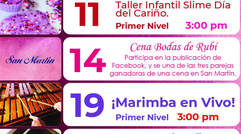 El sábado 11 de febrero a las 3:00 pm habrá taller infantil Slime Día del Cariño y el domingo 19 de febrero habrá marimba en vivo a partir de las 3:00 pm.