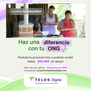 La primera convocatoria del Fondo Impacto Comunitario de TELUS Digital para 2026 estará abierta hasta el 20 de marzo y sus propuestas pueden enviarse a través del siguiente enlace: Fondo Impacto Comunitario GT