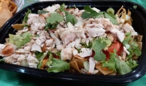El Pollo Nacho es elaborado con picos de tortilla dorada, salteados con paprika, bañados con queso cheddar derretido, con un toque de salsa de aguacate, aderezo cayena, lechuga, trozos de tomate, pollo asado 100% a la parrilla y cilantro.