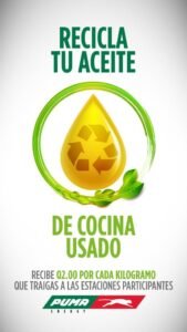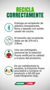 Esta nueva propuesta consiste en que los guatemaltecos puedan participar positivamente en esta actividad para el mejoramiento del uso de los recursos y beneficiarlos a través de promover el reciclaje del aceite vegetal que utiliza en sus hogares y/o negocios, para cocinar, y a su vez recibir una bonificación económica por su aporte y esfuerzo, con ello PUMA ENERGY se consolida como la PRIMERA marca de combustibles en Guatemala en llevar a cabo un proyecto de tal magnitud, y los PRIMEROS a nivel mundial en venta retail, en recolectar aceite de cocina vegetal usado para convertirlo en BIODIESEL, confirmando su responsabilidad y compromiso, con las comunidades donde operan y el mundo.