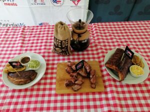 Barbacoa El Barretal: jugosas costillas – baby back ribs – bañadas en salsa barbacoa y con un toque de café de la Finca. Acompañadas de papas fritas y repollo preparado.